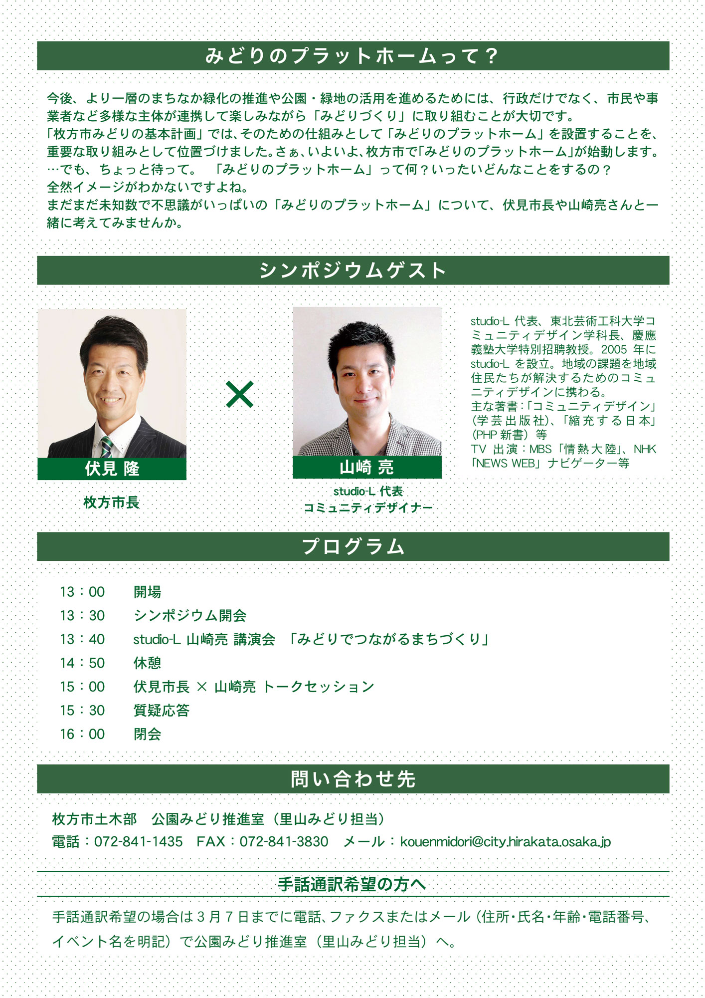 3月18日13時半より開催の「みどりでつながるまちづくり」というイベントのために山崎亮さんがラポールひらかたにやってくるようで、当日は伏見市長と対談もされる模様。