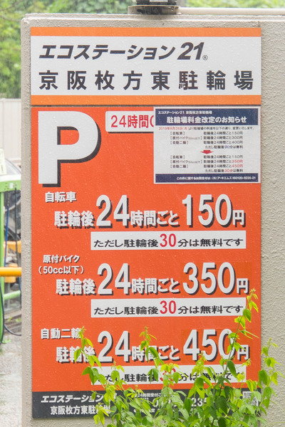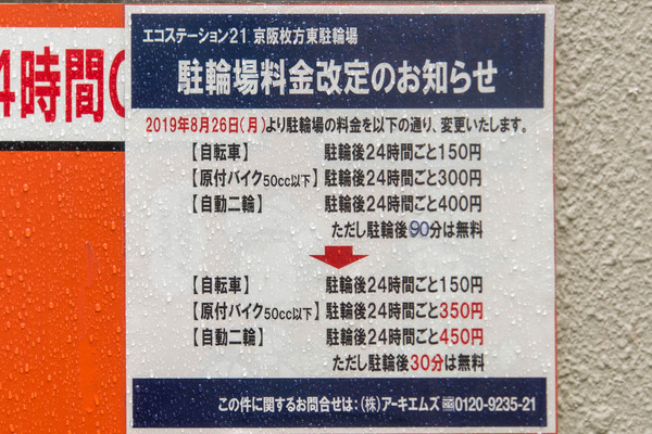 枚方市駅近くにある駐輪場「エコステーション21 京阪枚方東駐輪場」の無料時間が90分から30分に短縮されています。