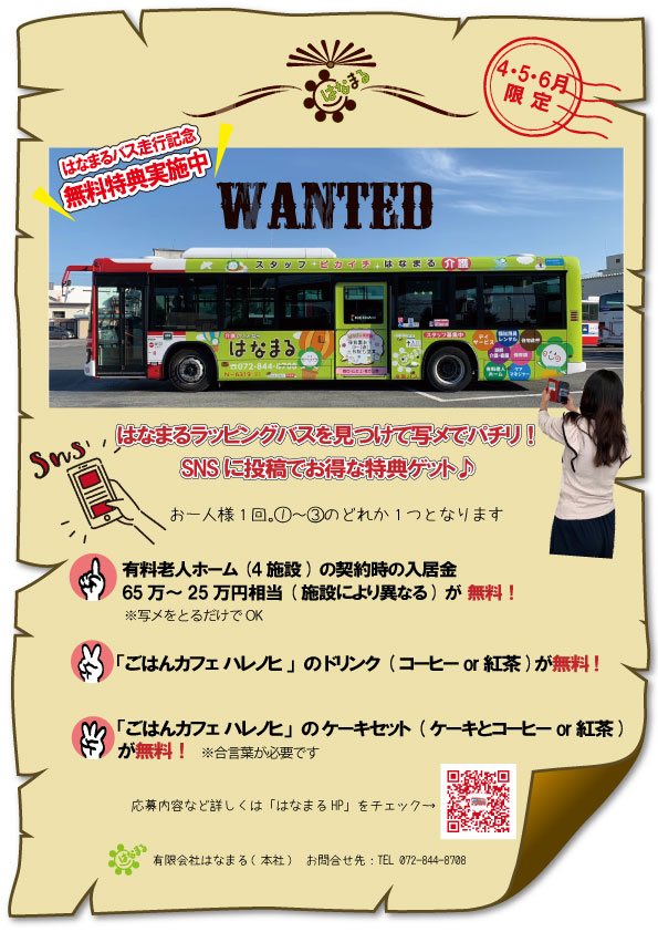 介護や保育園事業を枚方中心に展開している「はなまる」では、はなまるラッピングをほどこした京阪バスを枚方市内中心に4月から1年間走らせます。