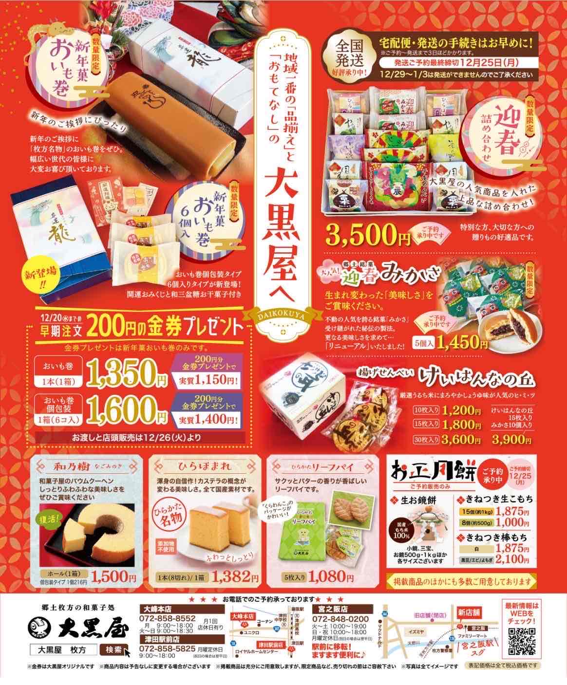 12/20㈬までに新年菓おいも巻か、新年菓おいも巻個包装6個入りをご注文のお客様に、大黒屋で使える金券200円分プレゼント!商品のお渡しは、12/26㈫~。