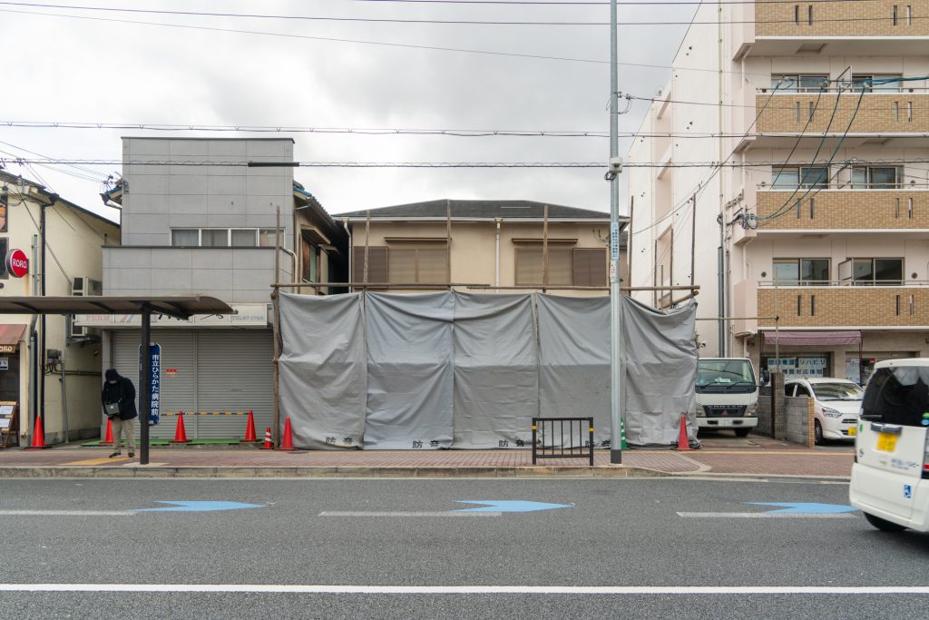 府道144号線沿い禁野本町の「喫茶壱番館」が幕で覆われています。