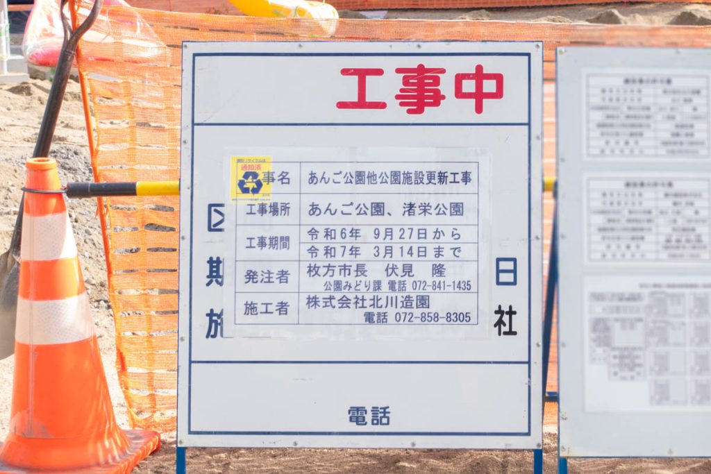 砂場側にいってみると、別のお知らせが。こちらの看板には、2024年9月27日から2025年3月14日までが工事期間と書かれています。砂場の工事のことなのかは定かではありませんが、遊具以外にも公園内の施設が更新されるようです。
