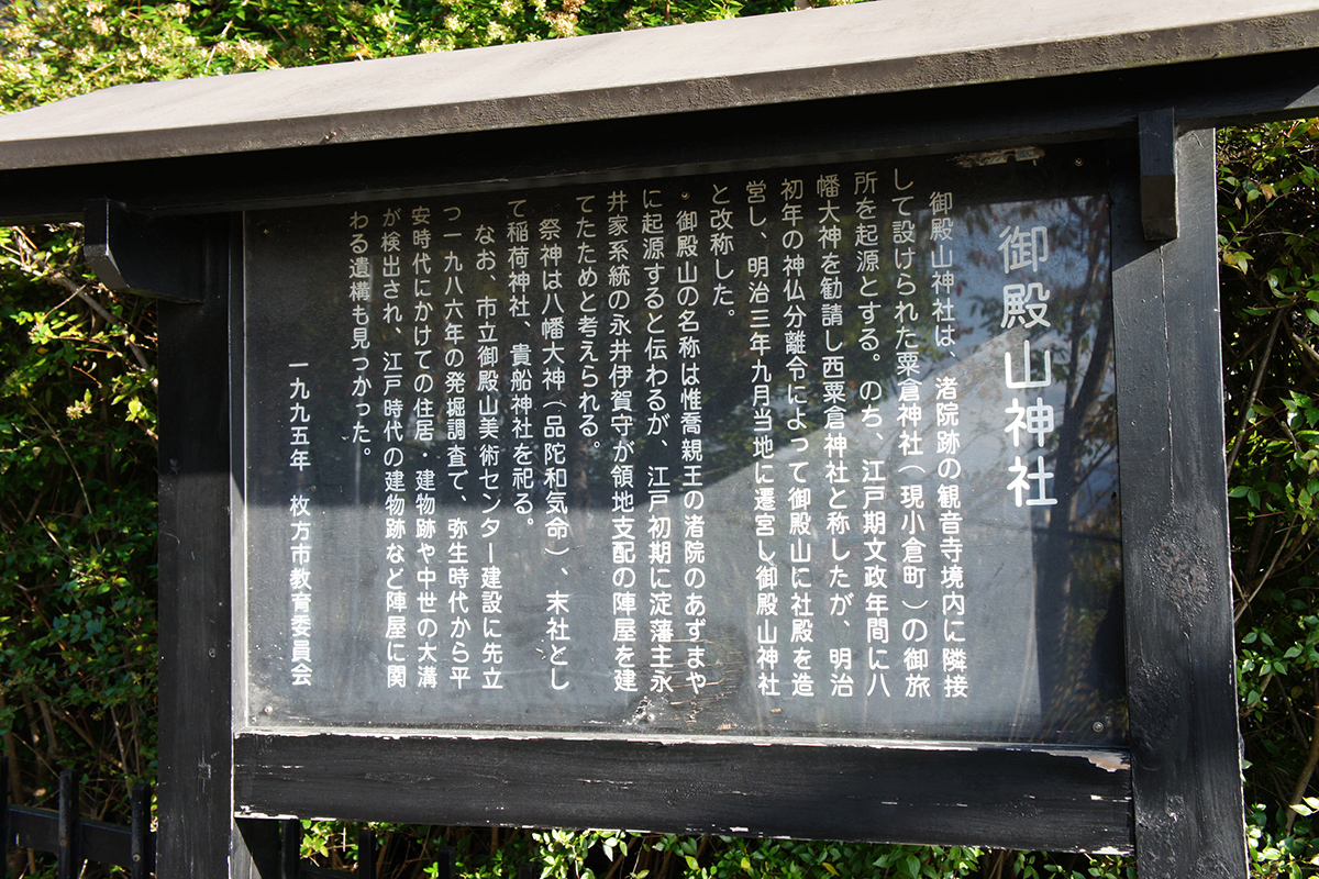 この『合戦』とは、応仁の乱のときから続いていた畠山政長と畠山義就の争いのうちの1つだったようです。『牧城(真木城)』というのは御殿山にあったらしいんですが枚方市史にもほとんど詳しいことは書いてません。ただ「城籍亭」という城郭マニアの方のサイトのこちらのページによると『正平年間に畠山義深が築城』し、『戦国期にこの城跡に渚城が建てられた』とあり、この場所にあった施設は牧城→渚城→永井家陣屋と変わっていったとされているようです。