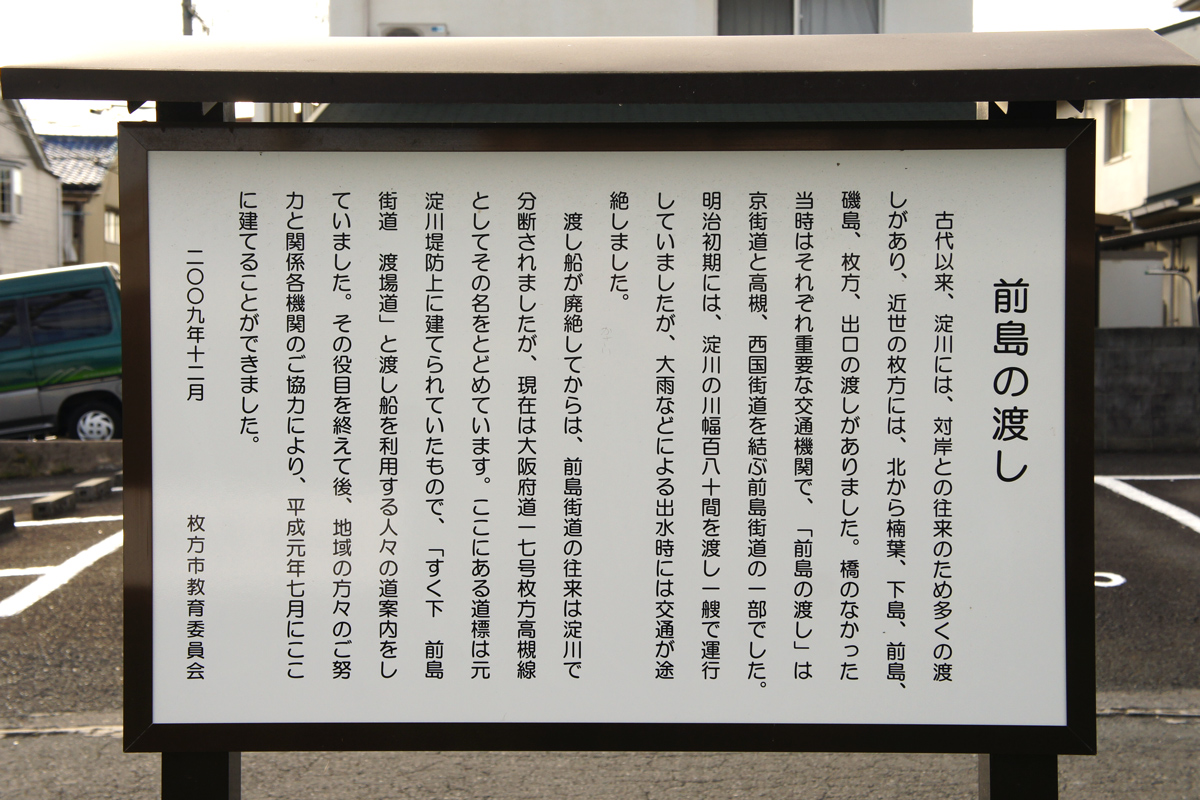 ところでどうしてこの道で高槻には行けないのに「高槻長尾線」という名前なのかというと、昔は淀川に牧野と高槻の前島を船で結ぶ「前島の渡し」があって、ここで高槻とつながっていたことから「高槻長尾線」という名前だったそうです。