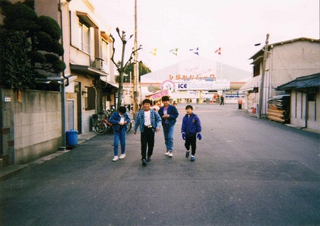 この写真は1991か1992年ぐらいにカズマ@ひらつー(写真左から二人目)がスケートしに行ったときのひらかたパーク正面ゲート前です。「ICESQUARE」の看板が見えてますね。1996年にリニューアルされる前なので、今同じぐらいの場所から撮った写真と比べると…