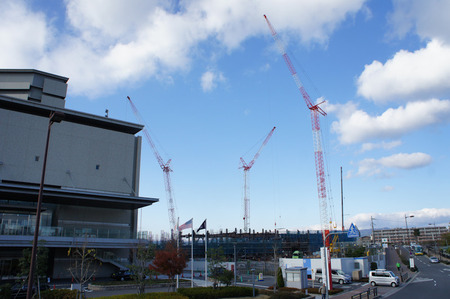 いま枚方市駅前の関西医大枚方病院の奥にでっかいクレーンが見えています。