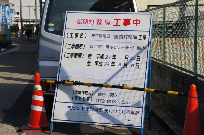 工事の案内看板。工事は3月16日まで。…ん?「街路灯整備工事」と書いてありますね。