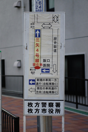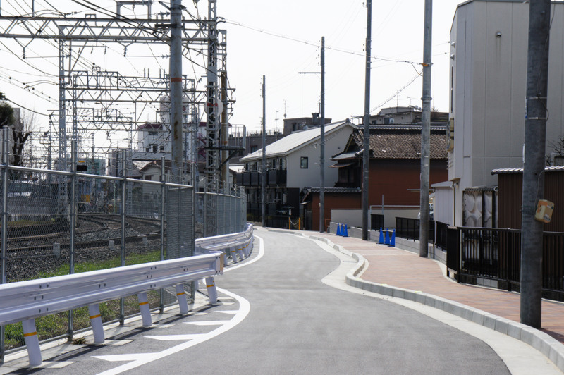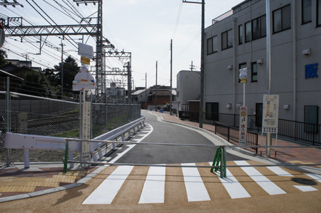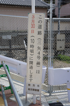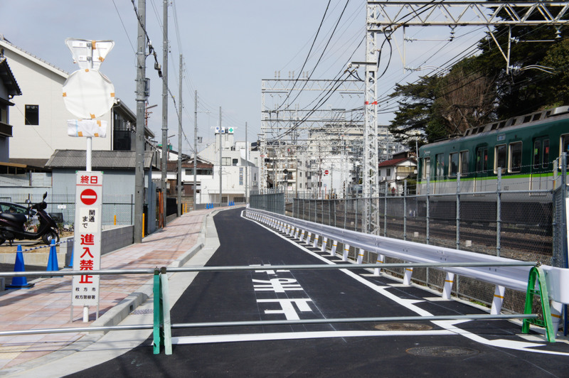これまでは車でここまで来ても、隣の歴史街道が一方通行なので枚方公園方向には行けませんでした。つまり枚方市駅側から車で枚方公園に行こうと思ったら旧1号線を通るのが一番近かったんですが、今回みっちょん(言うな)が開通することでここからでも枚方公園駅のほうまで抜けられるようになります。