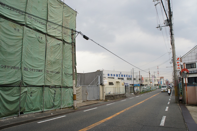 あっちが枚方市駅方面。そこに見えてる信号を左で国道1号線のエディオン(元ミドリ)の交差点、右で中央図書館です。