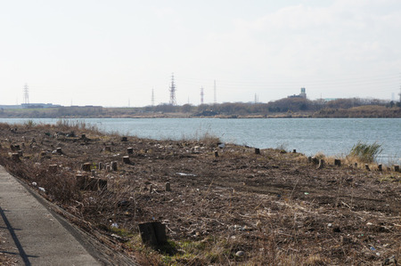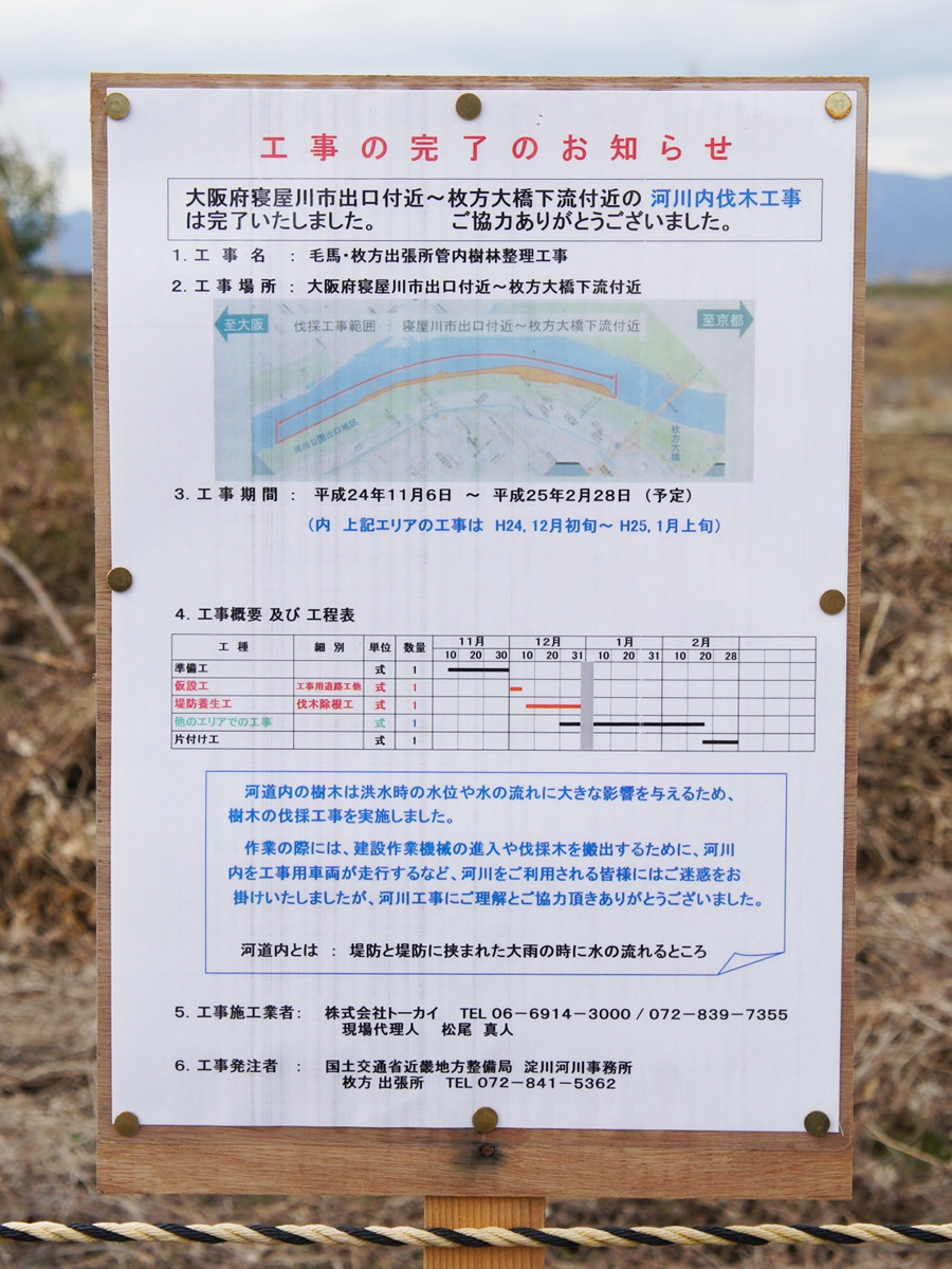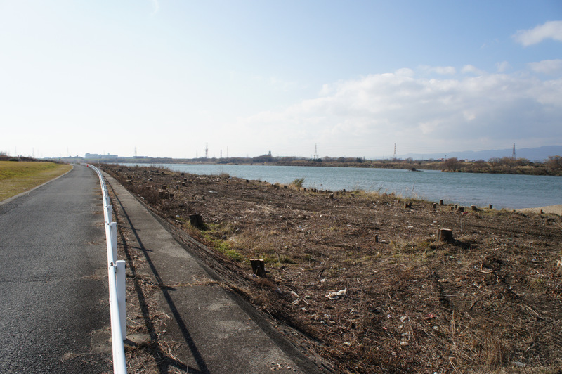 川沿いギリギリのところだけじゃなくて歩道を挟んで反対側も伐採されてます。あっちに枚方大橋とビオルネのイオンの看板が見えてるのでだいたい位置がわかるでしょうか。