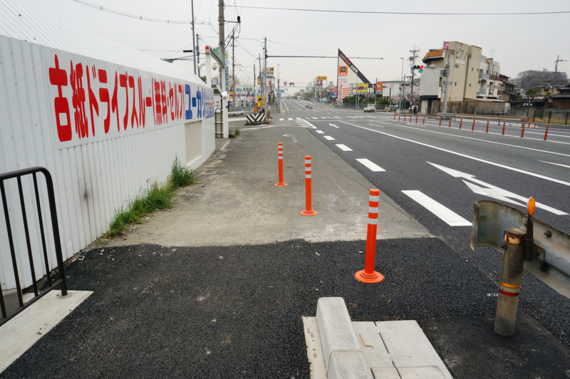 国道1号線の出屋敷~出屋敷南交差点で設置工事をしていた歩道が開通してます。