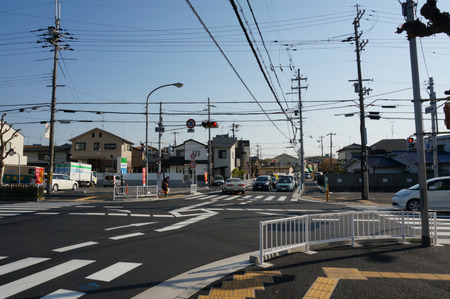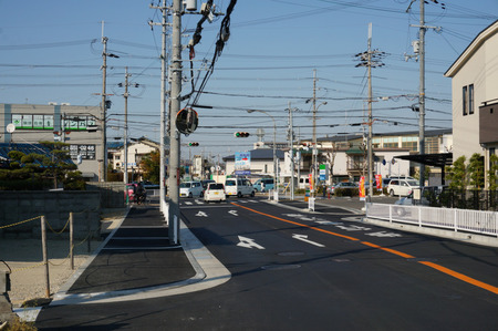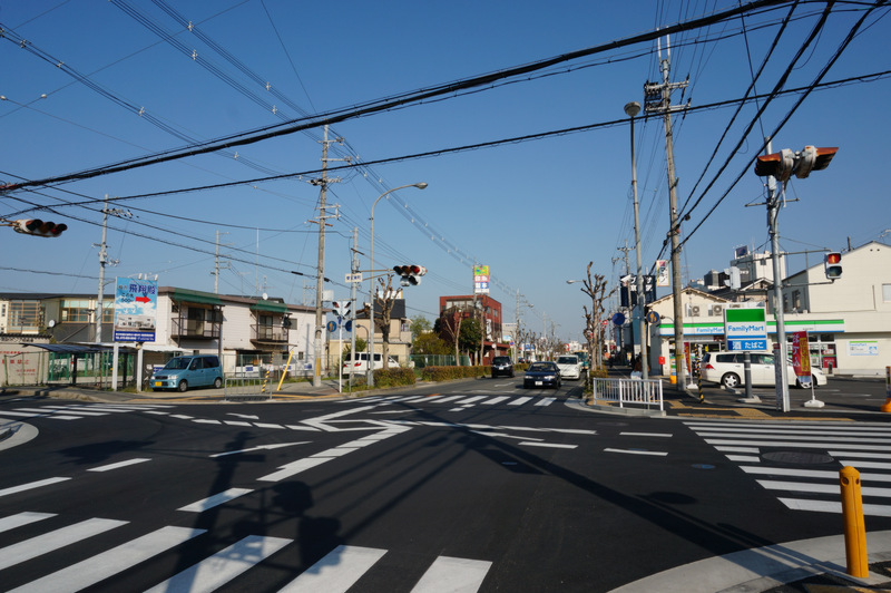 写真左の歩道も新しく作られました。交差点をまっすぐ渡ってすぐ右に枚方三中があります。