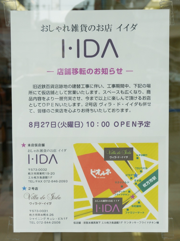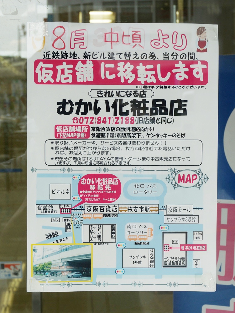 2012年2月末で近鉄百貨店が閉店した後も「おしゃれ雑貨のイイダ」と「むかい化粧品店」は営業していましたが、この2店舗が一時的に移転する旨の張り紙が出てます。