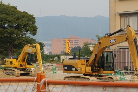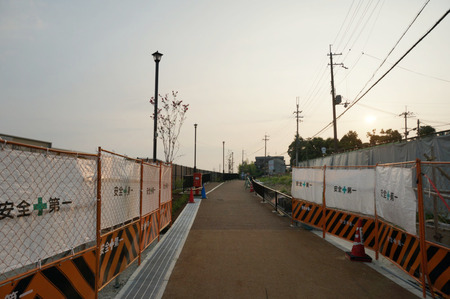 ここが工事の東側の端。国道1号線よりのほうです。向こうに進むと宮之阪駅のほうに出ます。