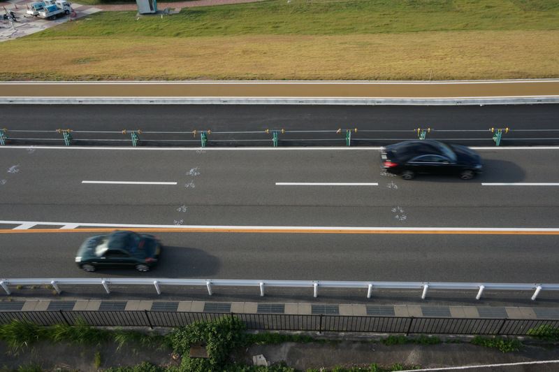 アスファルトが新しくて黒々としてるのが新しく作られてる車線。以前は歩道があった位置です。