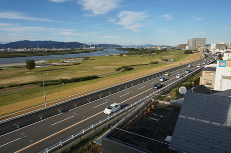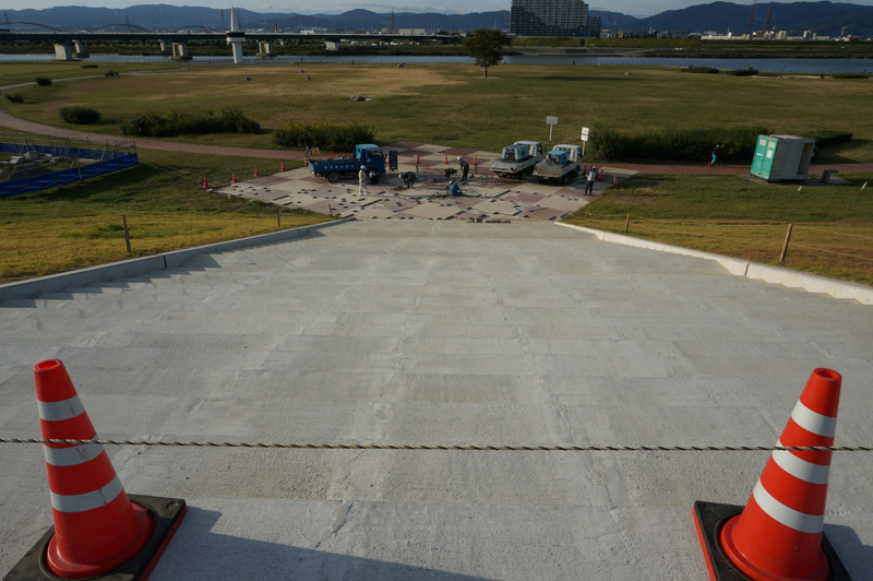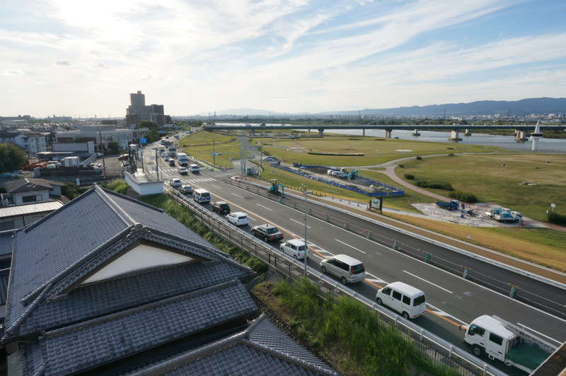 淀川とは反対側の傾斜をゆるやかにして堤防を強化するために、道路をそのまんま数メートル淀川方向に移動させ、水はけも良くさせるという工事です。
