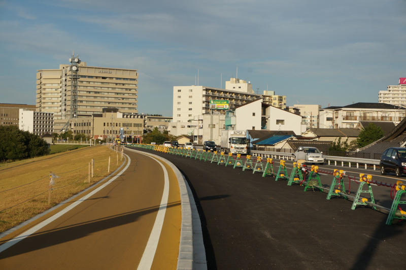 堤防の工事は桜町交差点までだったと思いますが、それだと道路のコースが急にずれちゃうので桜町交差点から枚方大橋方向も少し方向を変える工事をしてます。