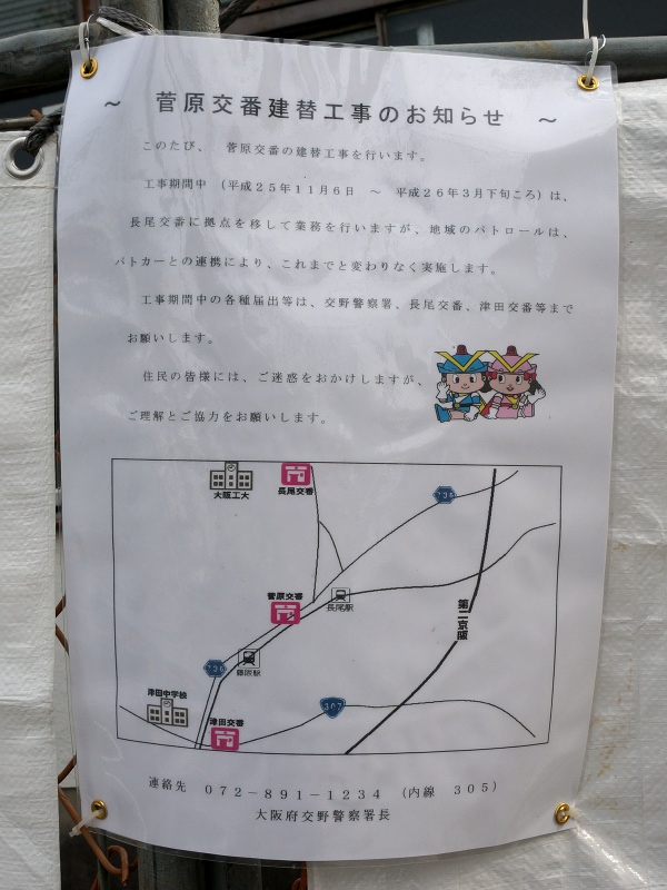 工事期間中(11月6日~来年の3月末ごろまで)は長尾交番に拠点を移しているそうです。描かれているキャラクターは大阪府警のフーくんとケイちゃん。
