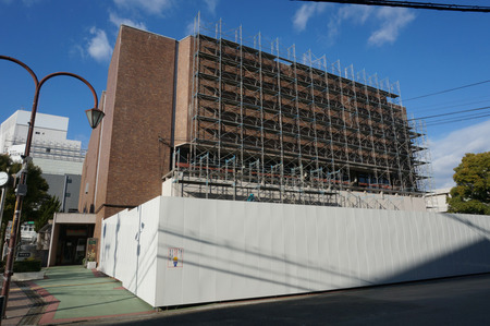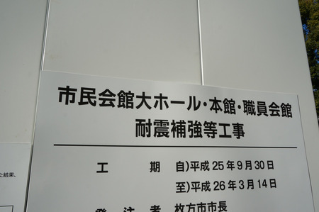 以前ひらつーでも記事にしましたが関西医大のほうに新しい文化会館をつくる計画があるらしいので、こんな工事をしてると解体するのかと思った人もいるかもしれませんが、耐震補強です。新しいのができると言ってもまだ期間があるし、今の市民会館を耐震性に問題があるまま使うわけにもいかないしといったところでしょうか。