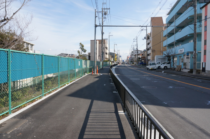 ただ最初の歩道橋のところから反対方向は歩道がありませんが、精神医療センターや百済王神社があるあたりの工事を見る限り車道が移動しそうなので、現在歩道がないところにも将来的に歩道がつくられるのかもしれないですね。