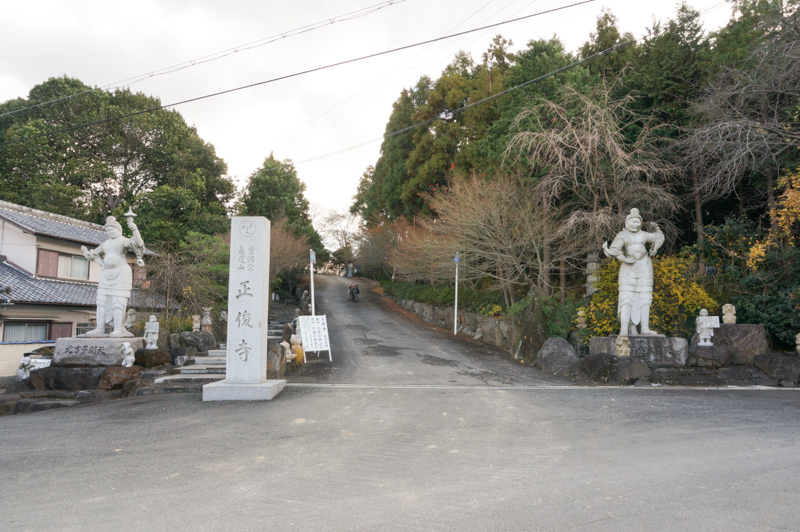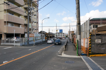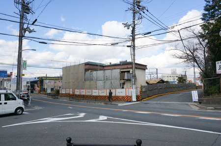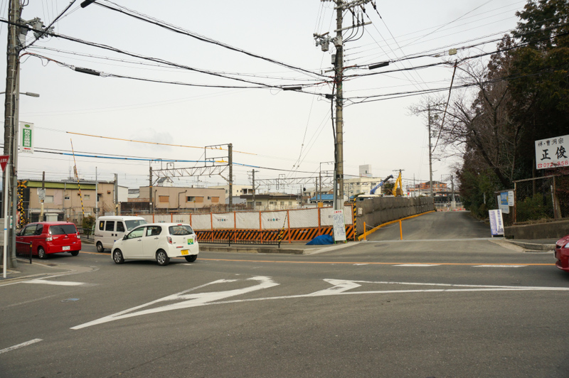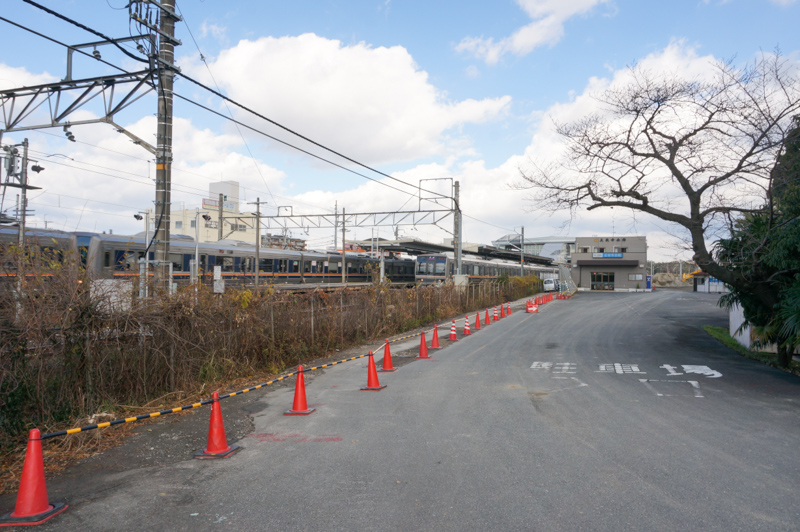 左前には長尾駅が見えてます(これも2013年12月の写真)。写真右の建物は正俊寺の建物。赤いコーンの立ってるところに歩道ができるようです。
