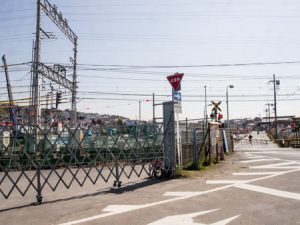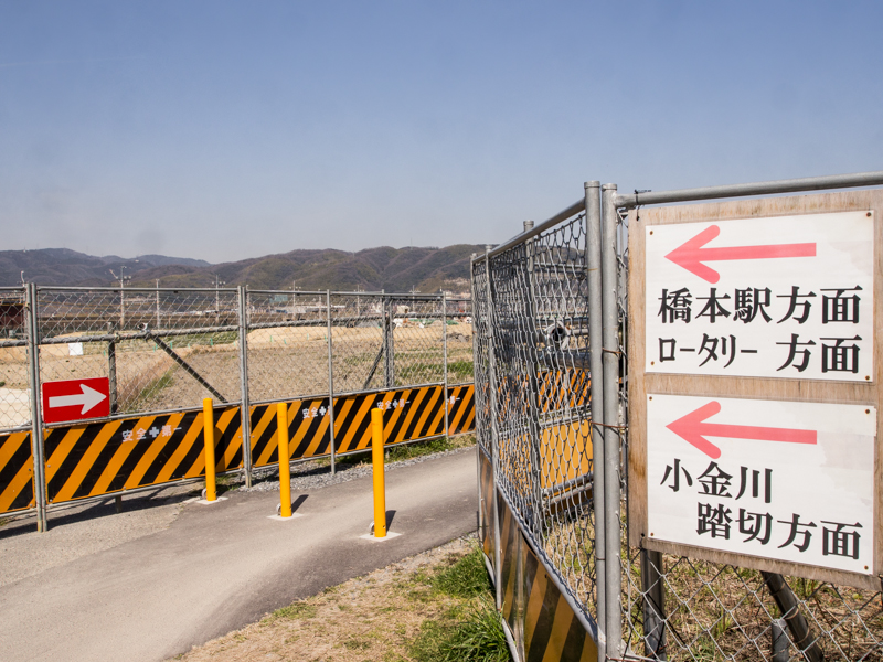 小金川踏切側の入り口を橋本駅側から撮影。踏切を渡ると旧1号線へ。