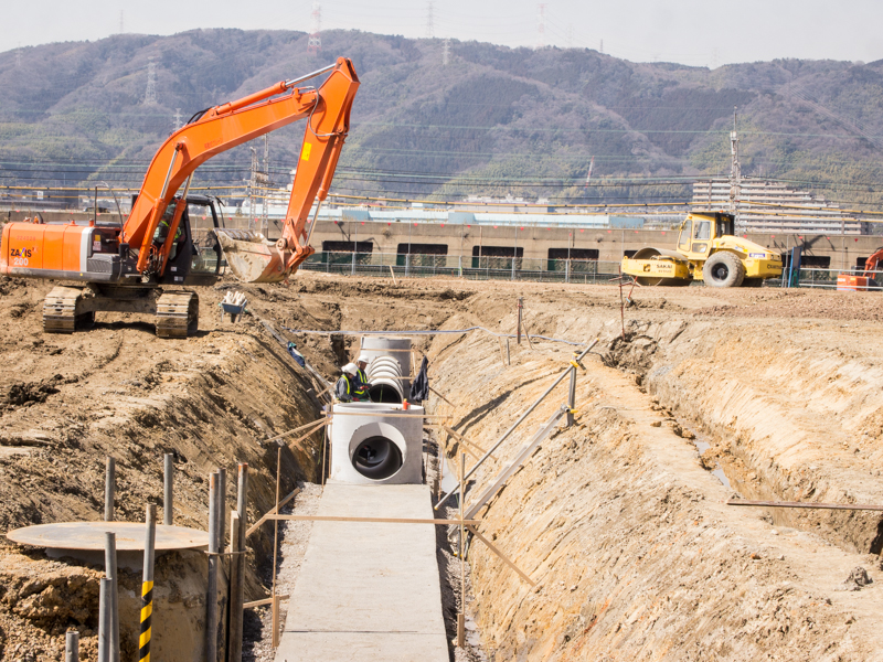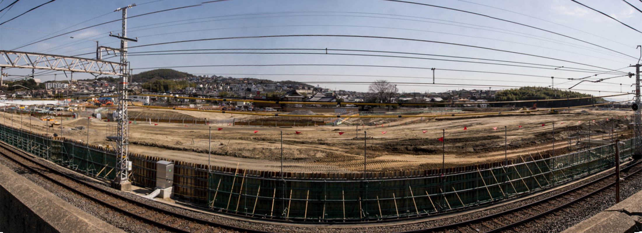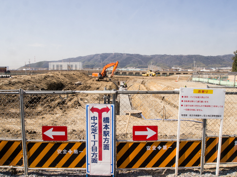 田んぼが広がっていた楠葉中之芝地区が住宅地や史跡公園になるということで今工事してます。前に記事にしたときから半年ほど経って工事がだいぶ進んだとのことで、見に行ってきました。