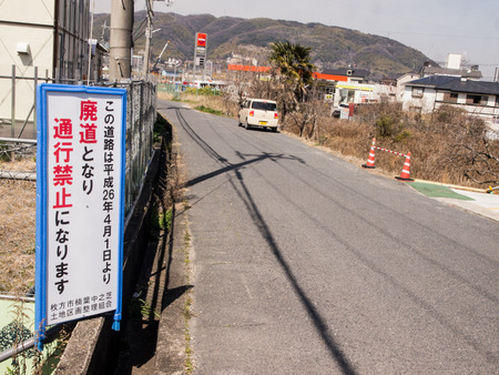 右側の道路が廃道になる予定の道路で、左側をまっすぐいくと最近移転したTSUTAYAくずは男山店跡地や、男山病院があります。