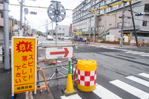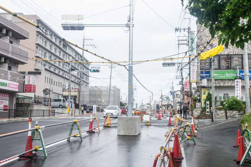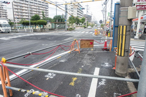以前は道路の中央で工事していましたが、そこは新しい枚方市駅方面の車線となり、以前枚方市駅方面の車線だったところが工事区間になってます。