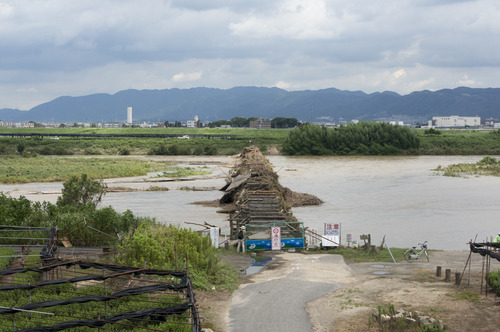八幡市の木津川にかかる「流れ橋(上津屋橋)」の橋桁が、台風11号の影響でまた流れてしまっています。