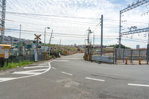 迂回路(水色)の入り口付近に戻って、そこから踏切側を撮った写真。こちらは以前は踏切まで続いていた道路のところ(写真1枚目の右側。)この左手の迂回路(ピンク)を進んでいきます。
