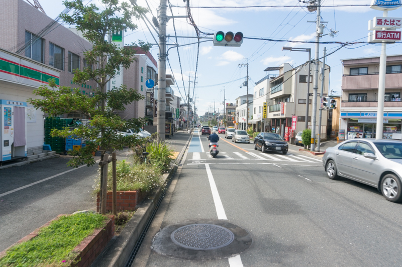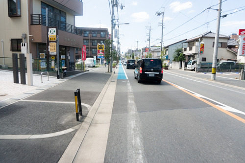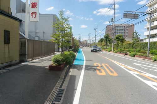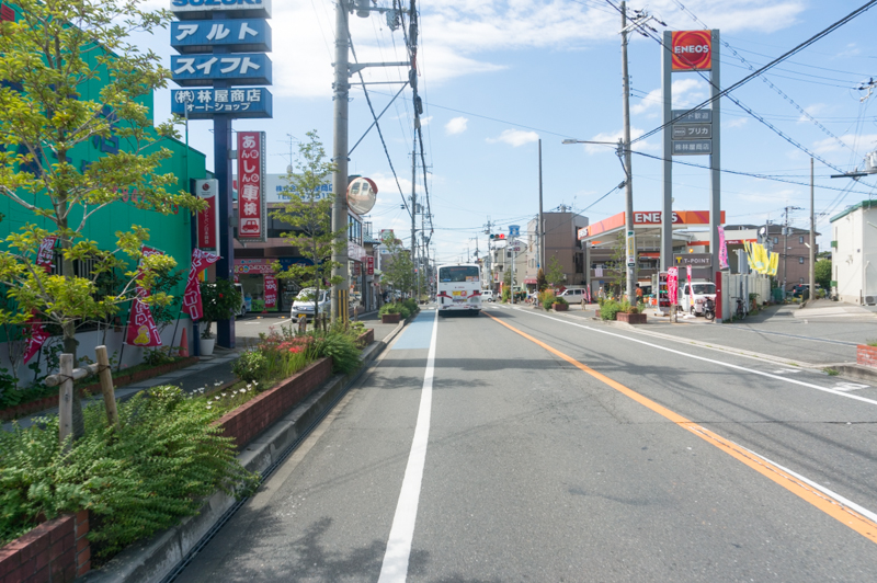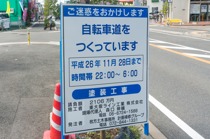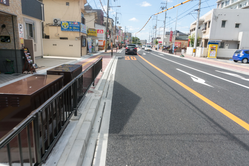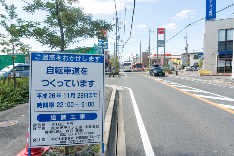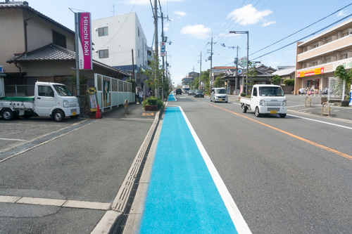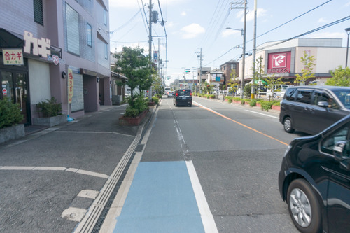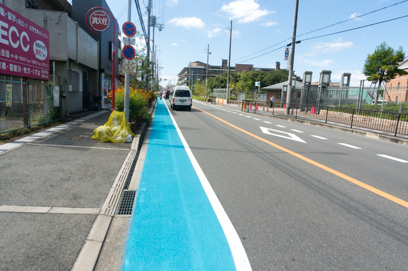 関西外大などの前を通る府道144号線の端が自転車道のため水色に塗装されています。