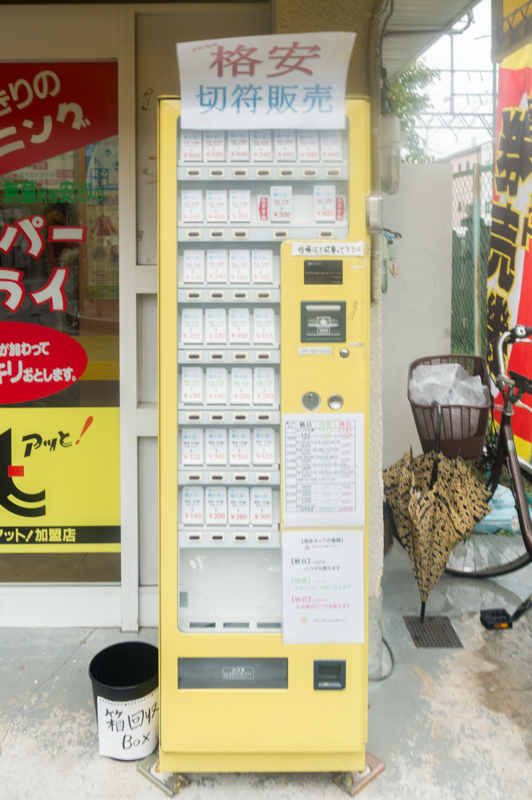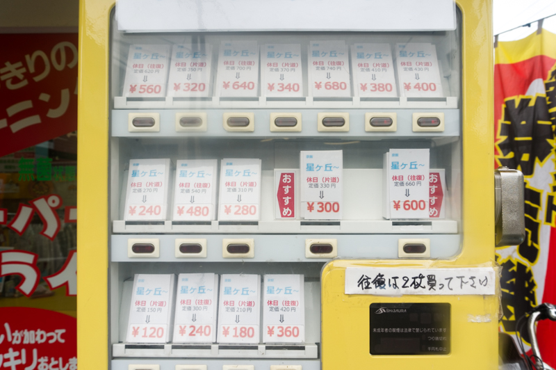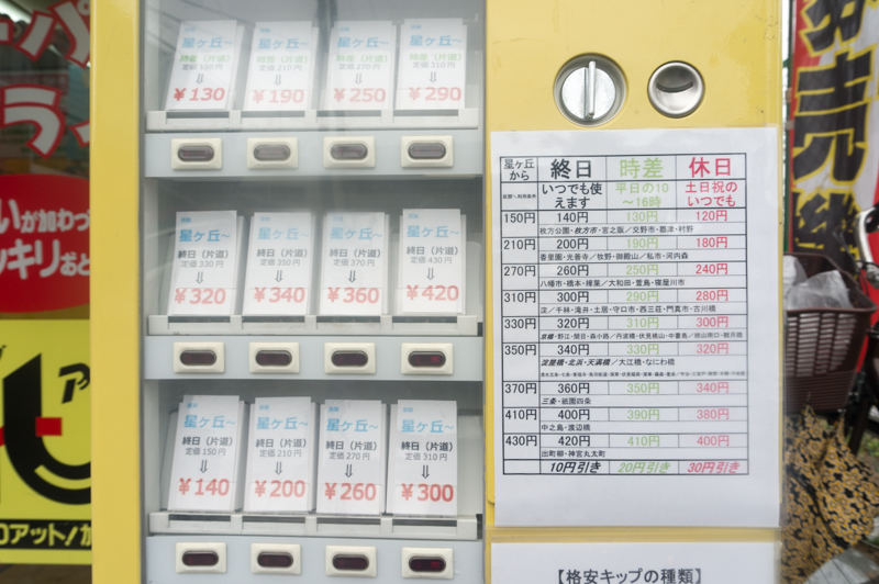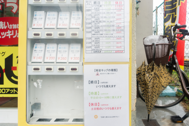 星ヶ丘駅前の自販機はどうやら終日切符・時差切符・休日切符を一律で各10円・20円・30円といった形で値引きしている模様。