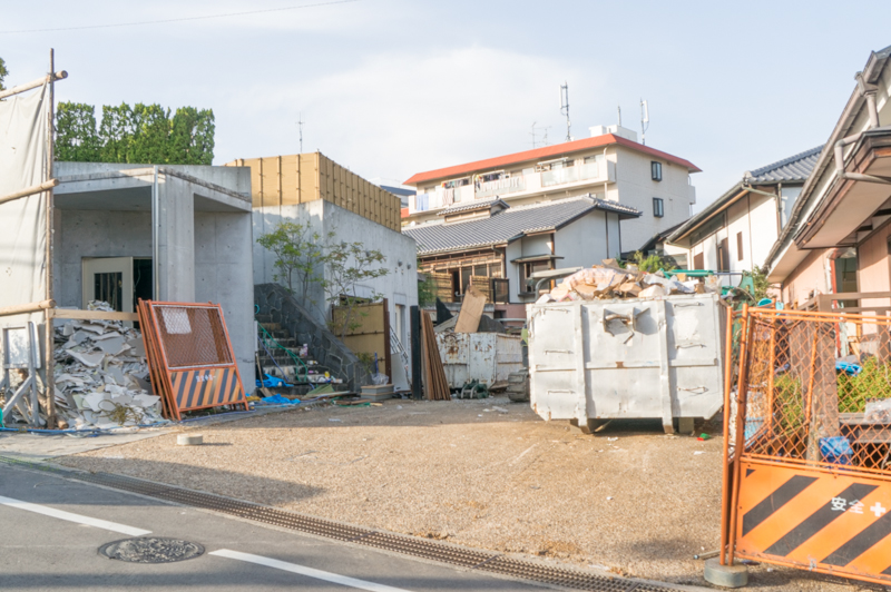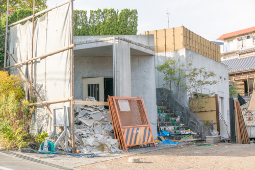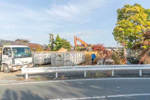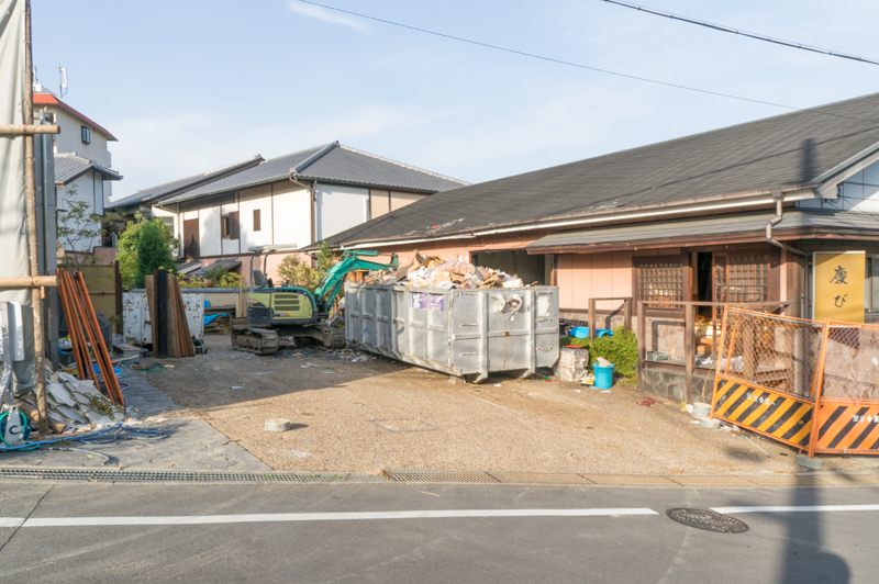王仁公園前の「魚慶」だった建物の解体工事がはじまっています。