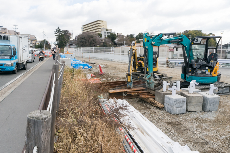 道が曲がる辺りで振り返って撮影。写真左手の白い柵があるということは、その柵沿いに道路ができるんでしょうか。