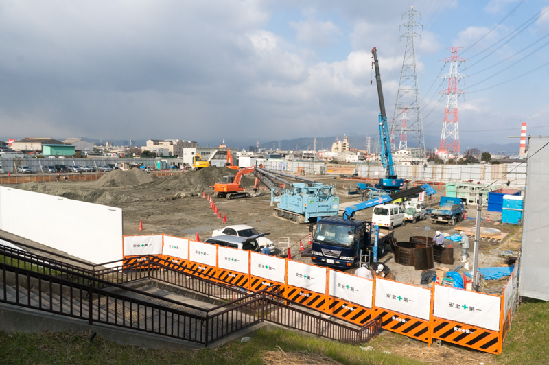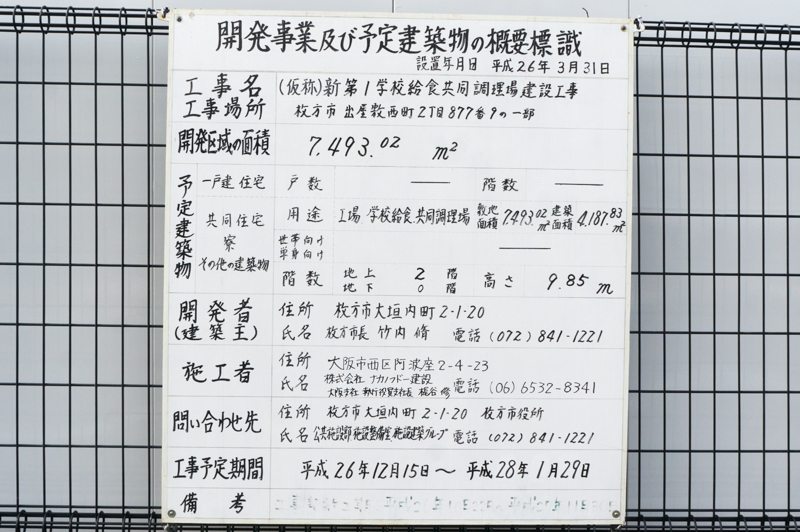 また、看板には工事は平成28年の1月に終了を予定しているとの記述がありますが、枚方市からのプレスリリースによると、建物の竣工自体は今年の11月頃を予定している模様。