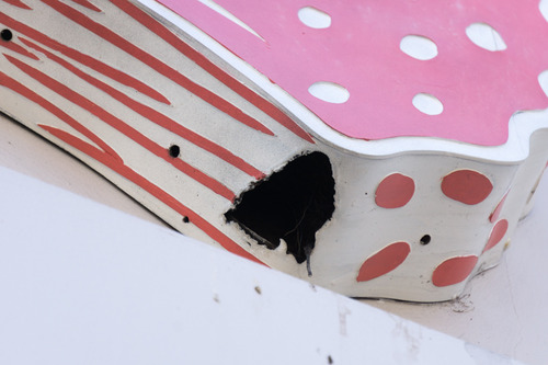 今回すずめの巣ができたのはこの鍵のモニュメントの赤色の一番下の部分。穴みたいなのが空いているのがおわかりいただけるでしょうか。