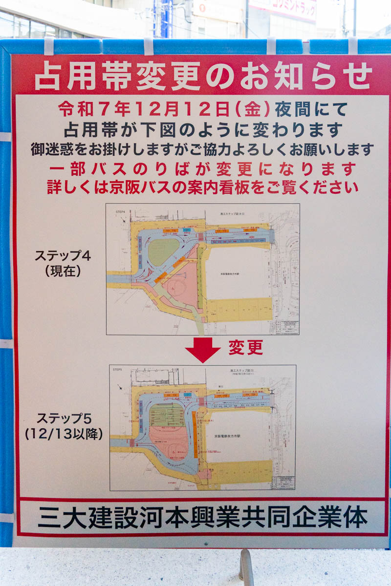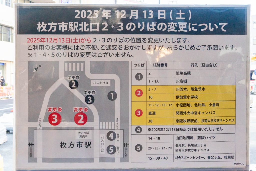 現地にあった貼紙によると、2025年12月13日(土)から枚方市駅北口の「2・3のりば」の位置が変わるようです。
