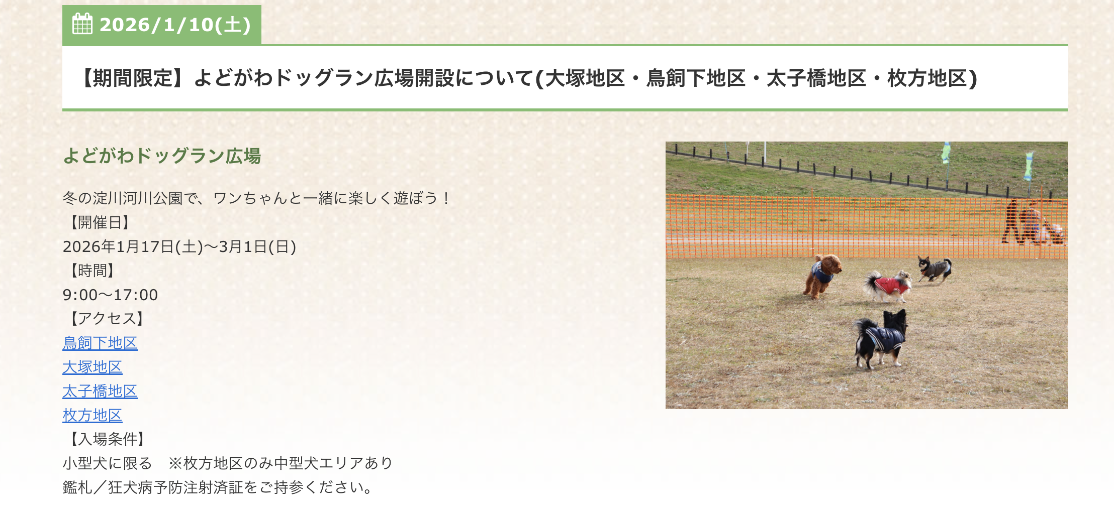 淀川河川公園公式サイトによると、枚方地区にもドッグラン広場が開設されたということが書かれています。