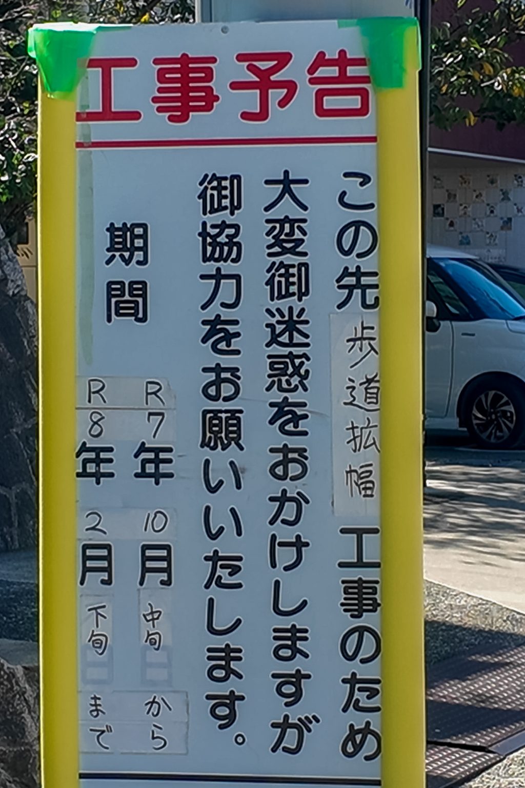 現地の看板によると、10月中旬から工事がスタート。来年2月下旬まで歩道拡幅工事が行われることがわかります。