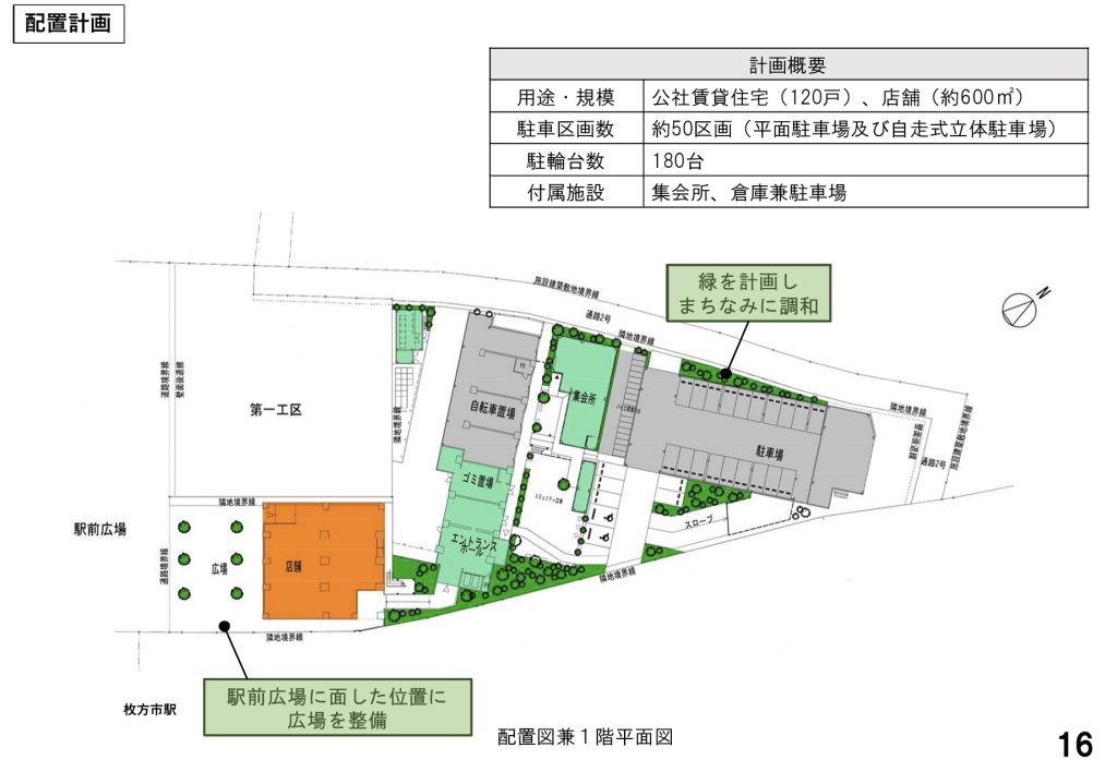 残る2つは、枚方団地の代わりとなる住宅部分。図でいう第1工区のところがさっきの商業施設があるところでして、その下のオレンジのところが低層階が店舗となる14階建ての建物。