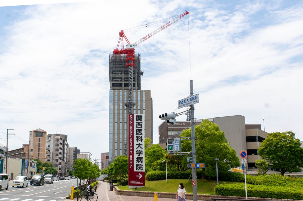 旧1号線沿いの関西医科大学附属病院の側に作っている「(仮称)関西医科大学タワー」が2段階目に進化を遂げています。