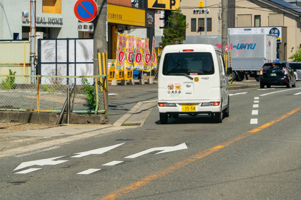 この道路に描かれている、左上と右の矢印です。