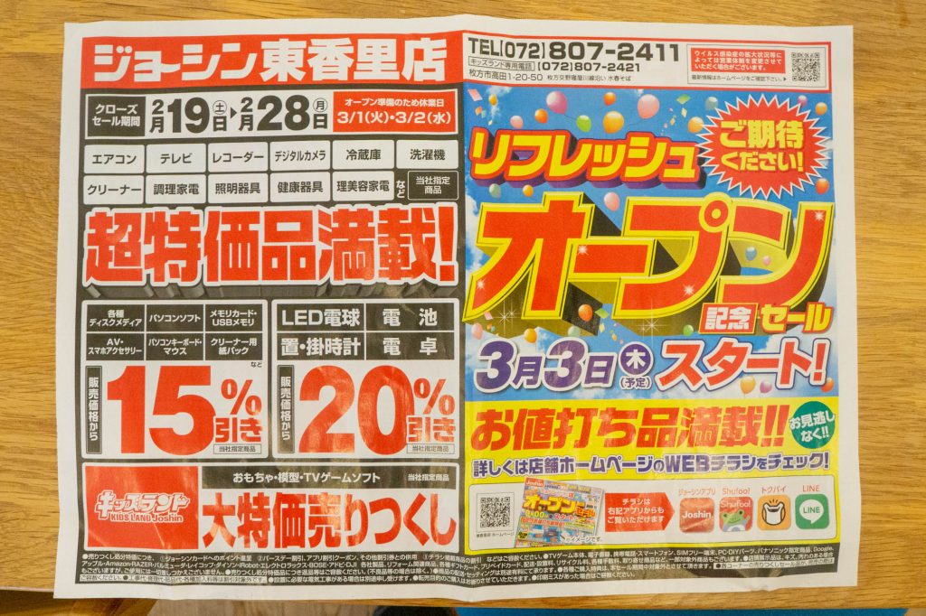 東香里にある「Joshin東香里店」が店舗改装するようです。