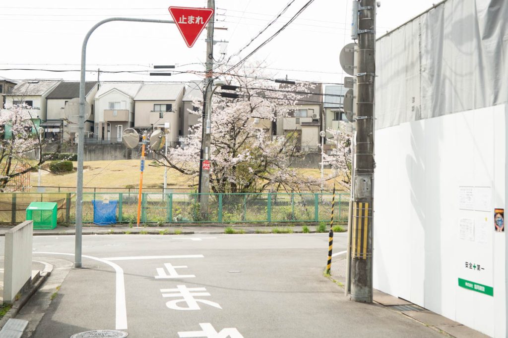 右が工事が行われている現場で、T字路を左に行くとコスパスイミングスクールなどが近くに。