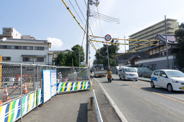 左が工事中の歩道で、その右横に現歩道。奥の方には禁野のマクドがあります。