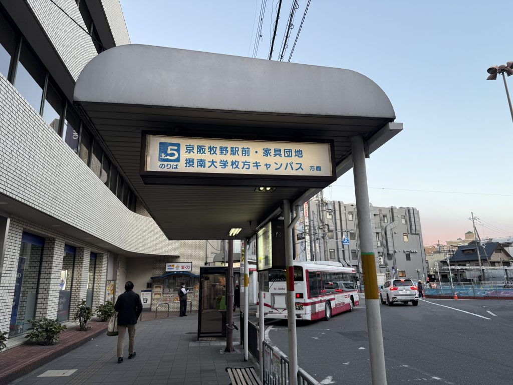 こちらはバス停の位置がほんの少し移動しただけなので、バス停の距離的にはほとどんど変わらないのですが、以前のバス停に行くと一瞬【5】京阪牧野駅前・摂南大学枚方キャンパス方面のバス停に変更されているのでびっくりされるのではないでしょうか。