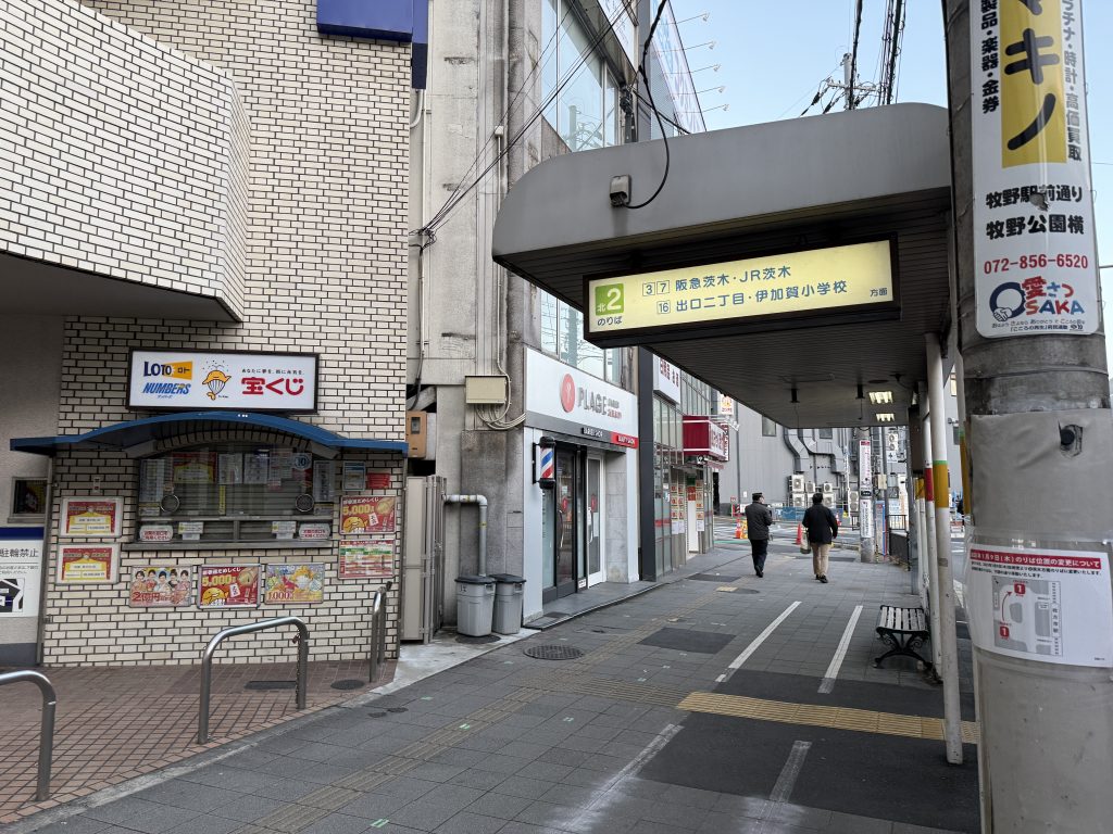 【1】JR高槻、阪急高槻行き乗り場は、従来のみずほ銀行宝くじ売り場前からHIRAKATA WOVEN前へ。