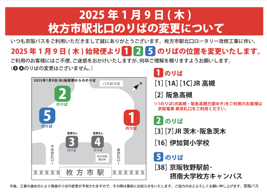 2025年1月9日から枚方市駅北口の京阪バスのりばの位置が変更されています。