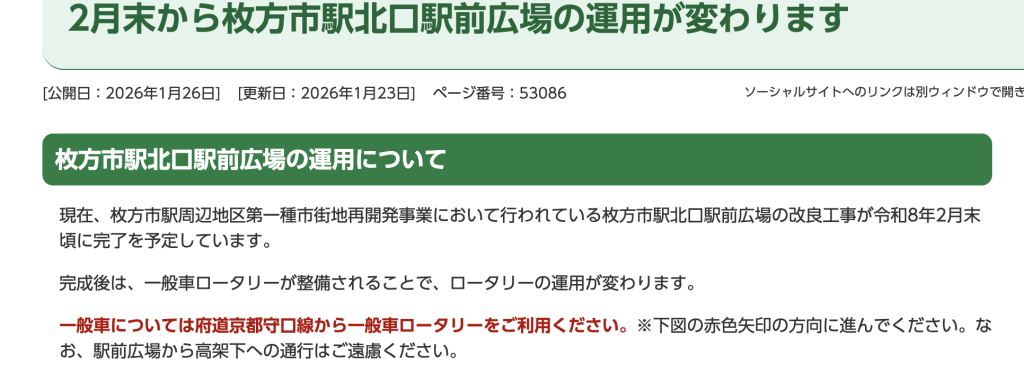 枚方市駅北口駅前広場の運用が2月末から変わるようです。